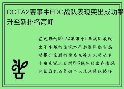 DOTA2赛事中EDG战队表现突出成功攀升至新排名高峰